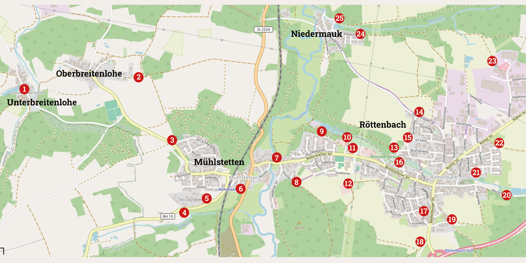 | 1. Unterbreitenlohe | 7. Rezat/ Röttenbacherstr. 7 | 13. Brunnenweg | 19. Holzbruckweg / Pfaffenweg |
